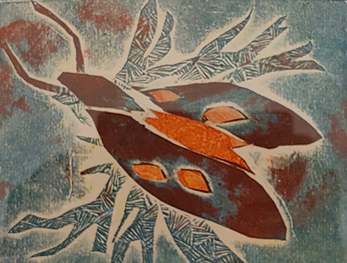 Collagraphs are produced by sticking a variety of materials onto thick card. Textured paper, string, tissue paper and grit can be used. The finished ‘plate’ is then inked up with printing ink, which is pushed into the surface with a dabber and scrim. Areas which need highlighting can be burnished with tissue paper. It is then printed onto slightly damp paper using an etching press. The process is repeated for each new print, maybe with different colours. Each print is a unique original piece of work.